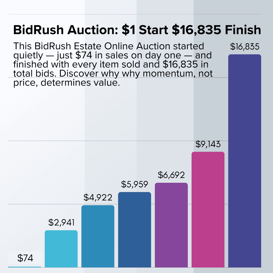 That’s the power of the $1 start — what begins quietly builds into a rush of competition that clears everything out and drives prices far beyond expectations.