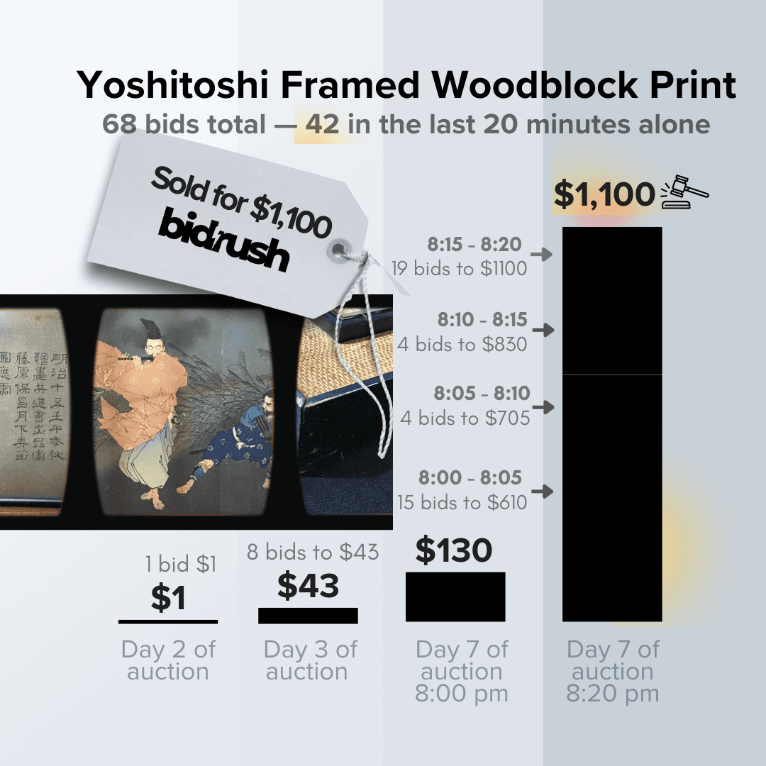 Starting at $1 means setting the stage for your items to shine. This auction began quietly and ended with every item sold — including a single print that soared more than 700% in minutes. That’s the BidRush Effect: where every $1 start has the potential to end in a bidding rush. Reclaim space. Recover value. That’s what a BidRush auction delivers!