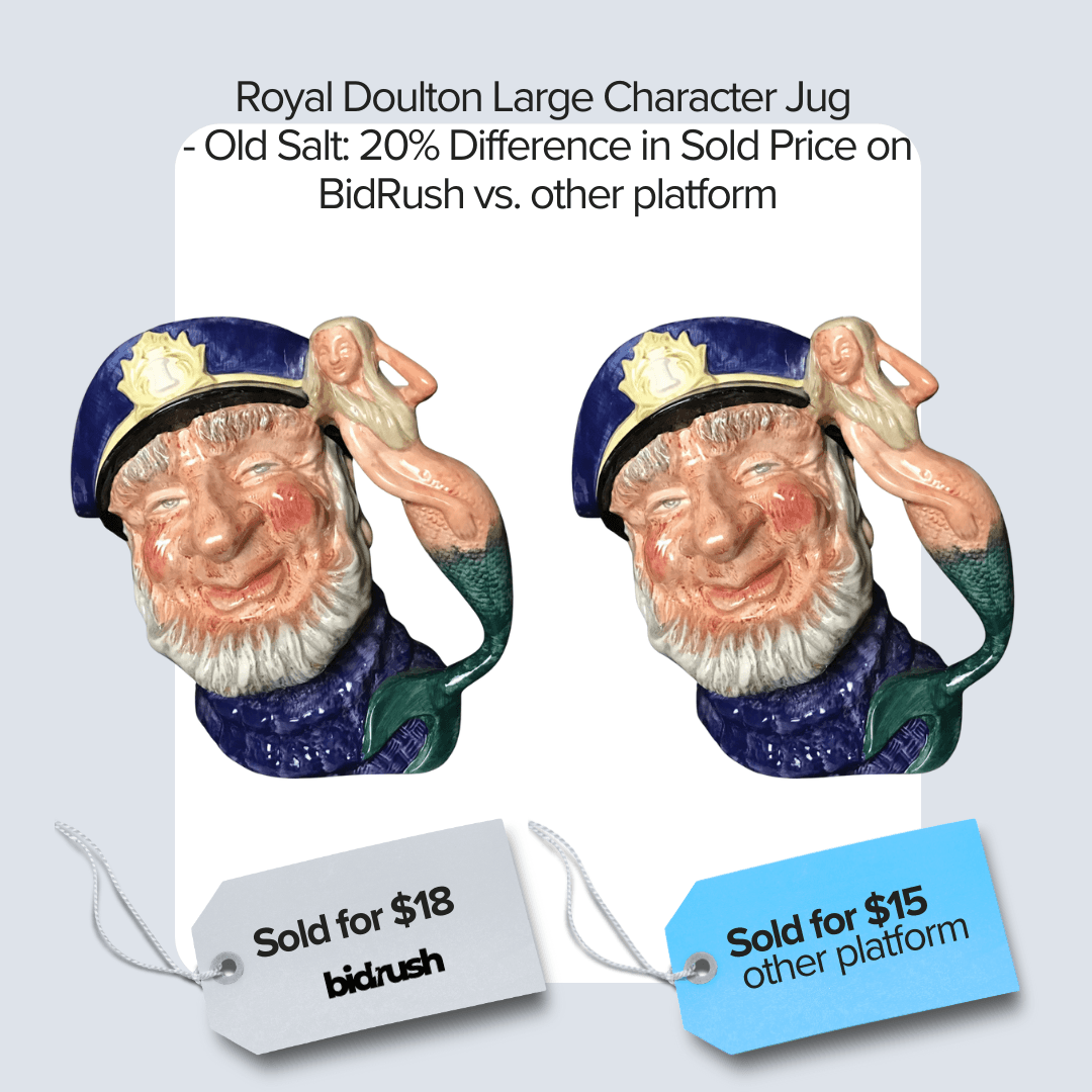 Additionally, Lifecycle conducted a like-for-like test, introducing two identical items — the Royal Doulton “Old Salt” character jug — both listed on BidRush and the other auction site. The jug brought $18 on BidRush vs. $15 on the other site. That’s 20% more in hammer price and a higher net return for the estate.